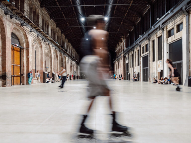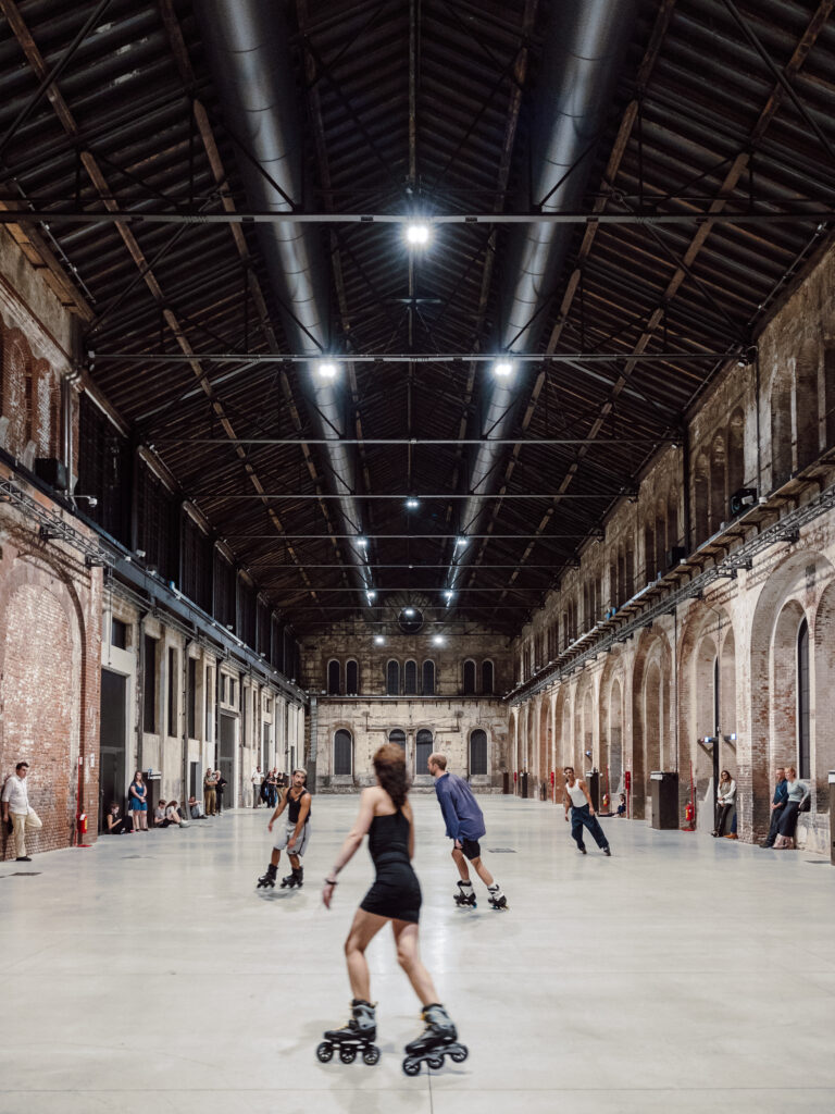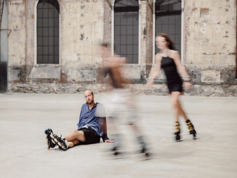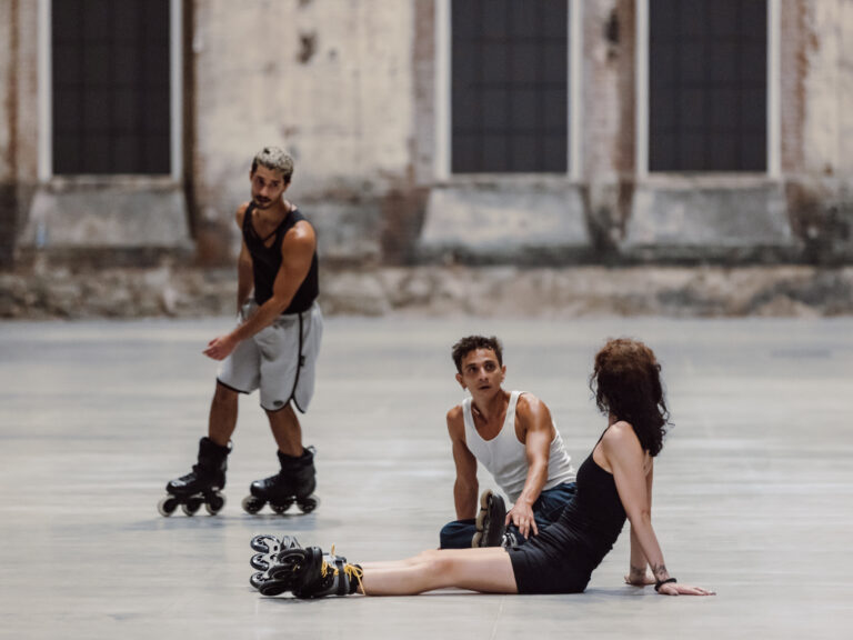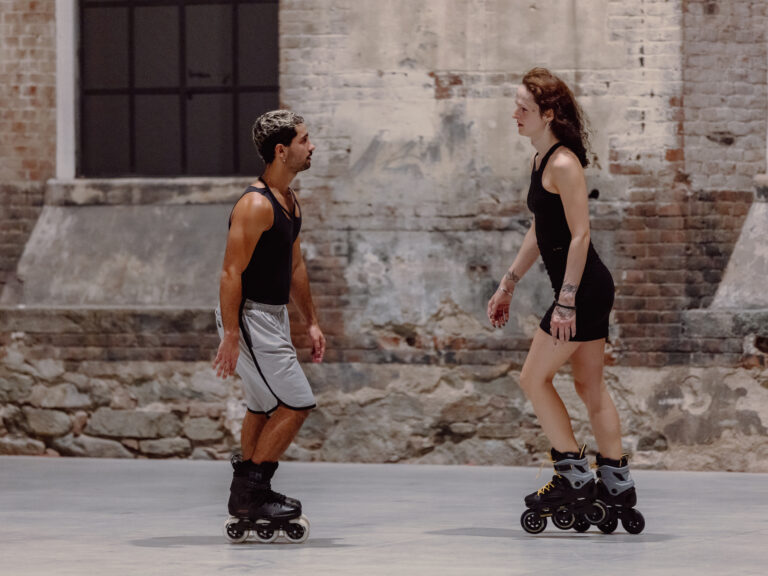 In Alex Baczyński-Jenkins’s Us Swerve (2014), performers on rollerblades orbit one another while reciting, remixing, and reformulating fragments of poetry that meditate on the subject of desire. This polyphonic choreographic “score” is perpetually altered by the performers’ movements, attitudes, and affects. As the performers circulate, they begin to channel a queer archive of verses and inflections, including lines from writers such as Essex Hemphill, Eileen Myles, and Langston Hughes. These articulations of desire and the sensuality of repetition both set the rollerbladers in motion and create a tableau for them to move through.