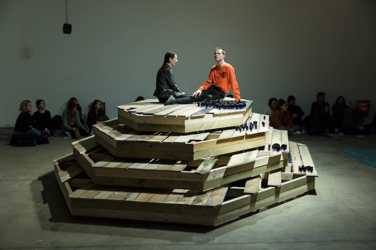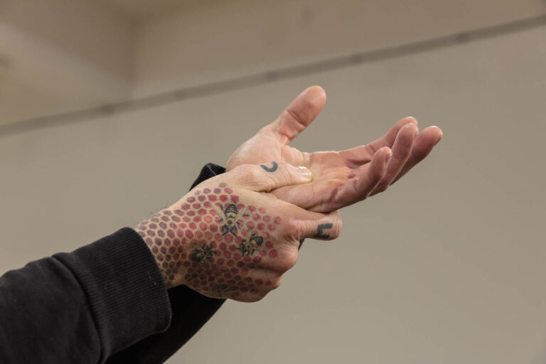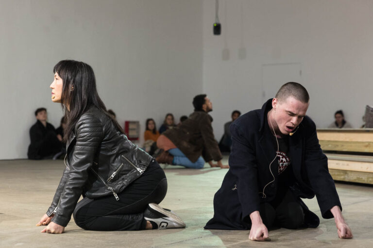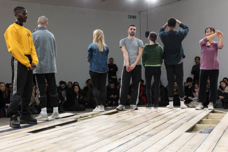 The work unfolds over four episodes and is a choreographic mediation on the relationships between affection, touch, desire and loss. Each episode has its specific embodied vocabulary through which the performers navigate intimate and fragmentary exchanges, reflecting on the edges of subjectivity, corporeality and relationality. The piece proposes another relationship with duration and attempts to produce a community of visitors by having the work unfold over a period of 4 to 8 weeks. The reflection on the temporal, the haptic and collective intentionality present in The tremble, the symptom, the swell and the hole together are significant aspects of Baczyński-Jenkins’ practice.